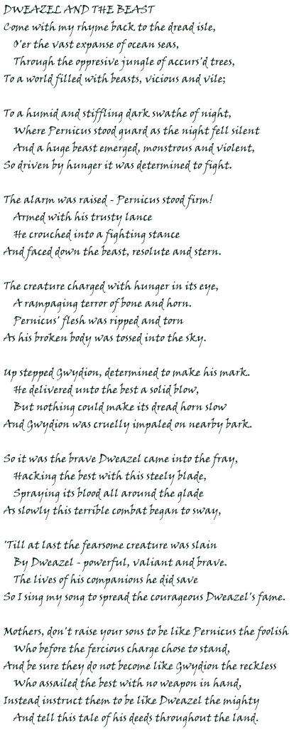 Raven, who had found sanctuary in the boughs of his beloved trees later claimed to have seen the remains of an arm hanging from beast's mouth as it sniffed around the tree he was hiding in. When we found him later he was wild-eyed and only just coherent. His wits were gone and it was not until well into the following day that we were able to calm him down. All of our senses were strained to breaking point that night and in some way I think we all actually wanted to believe that he had seen the remains of Dweazel hanging from that awful jaw. Each of us wanted some kind of proof that Dweazel was actually gone, something tangible and solid, like that torn remains of an arm, so that we had something grieve over.